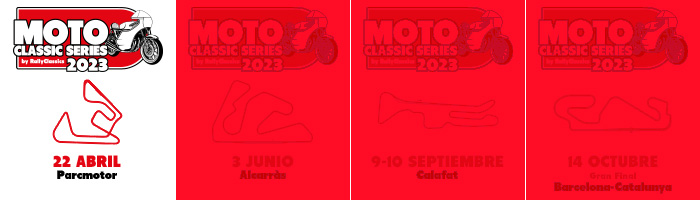 Cinco pruebas forman la temporada 2023 de las MotoClassic Series. Motos clásicas de GP, Resistencia y Sport, y youngtimer fabricadas hasta el año 1994 pueden participar en este certamen de Regularidad en circuito. En esta temporada 2023 visitaremos 4 circuitos a lo largo de 7 meses. El calendario se abrirá el 22 de abril en Parcmotor Castellolí. El 3 de junio se visitará el Circuit d’Alcarràs, antes del parón veraniego. Tras el verano llegará la cita doble del 9 y 10 de septiembre en el Circuit de Calafat, con dos meetings en dos días, y algunas sorpresas que estamos preparando. Cerraremos la temporada el 14 de octubre con la tradicional Gran Final del Circuit de Barcelona-Catalunya. Una ocasión única para competir en un trazado de Gran Premio y prestigio internacional. Las MotoClassic Series te garantizan fair-play, diversión y seguridad a bordo de tu moto clásica. ¡Te esperamos!