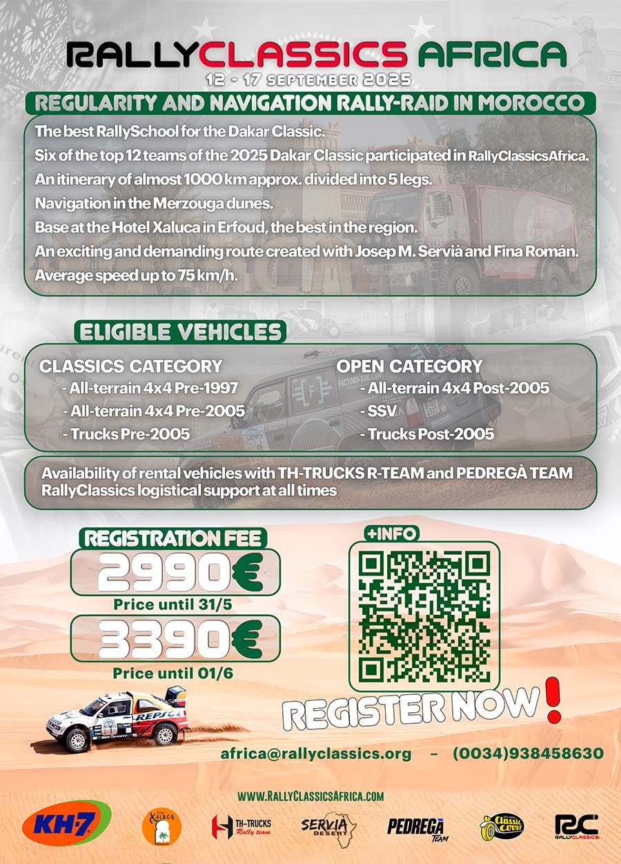 After the huge success of the first two editions, RallyClassics Africa returns in 2025, having become the benchmark preparation rally-raid for the Dakar Classic and Africa Eco Race. Six of the top 12 teams of the 2025 Dakar Classic participated in RallyClassics Africa, including the winners of both events, Carlos Santaolalla and Jan Rosa!