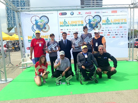 La primera edición del NO LIMITS MOTOR TOUR – BARCELONA 2014 se saldó con gran éxito, tras la apuesta del Ayuntamiento de Barcelona por mostrar una ciudad amable, sin barreras, y respetuosa con el medio ambiente. 33 equipos se retaron en el Moll de Marina de Barcelona, para celebrar la primera prueba sin barreras y ecológica de Estrategia y Orientación. Fue toda una première mundial, que tendrá sus réplicas en otras ciudades del mundo en los próximos años, y que contó con tres celebrities como Albert LLovera (piloto de Rallyes en silla de ruedas), David Rivas (primer conductor europeo sin brazos) o Ferran Martínez (ex-jugador de basquet). En total 16 conductores con algún tipo de discapacidad física, y hasta 10 marcas de vehículos ecológicos, se dieron cita en esta primera edición del NO LIMITS MOTOR TOUR, entre los que vencieron Mesalles-Mesalles, Llonch-Llonch, y Oliver-Onghena, que recibieron sus trofeos -como la totalidad de los participantes- de manos del Secretari General de l’Esport, el Sr. Ivan Tibau.