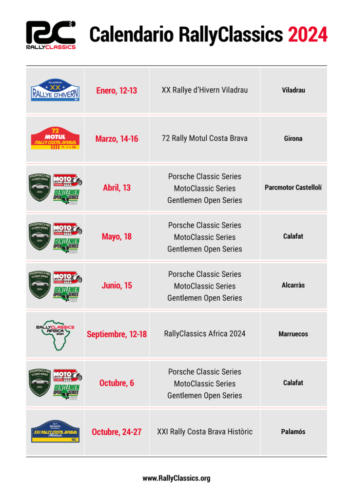 A continuació et presentem el calendari de la temporada 2024 de RallyClassics, format per 8 proves al llarg de 10 mesos. Comença a reservar les dates!