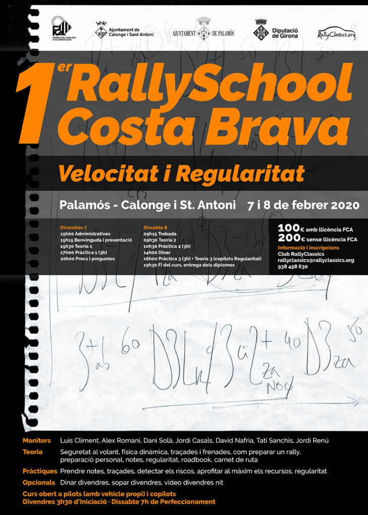 Pues no te pierdas lo 1er RallySchool Costa Brava, un curso donde podrás aprender de los mejores maestros: Luis Climent, Alex Romani, Dani Solà, Jordi Casals, David Nafría, Tati Sanchís, y Jordi Renú. Teoría y práctica en una primera jornada de Iniciación, y una segunda jornada de Perfeccionamiento. Desde el roadbook, carnet de ruta, o como preparar un rally, hasta las notas, los aparatos de regularidad, las trazadas y frenazos, o como aprovechar al máximo el potencial de cada vehículo, detectando los riesgos de la carretera.