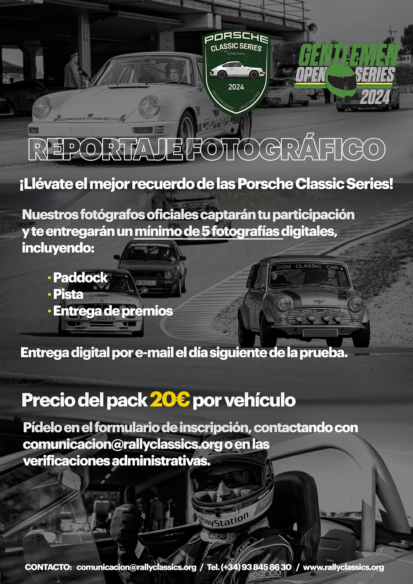 - Campanya “Comparteix les Classic Series 2024”: descompte del 50% en els drets d’inscripció per a equips que convidin a un nou participant (equip novell) a debutar en les Porsche Classic Series. Aquest descompte s’aplica tant a l’amfitrió com al seu equip convidat.