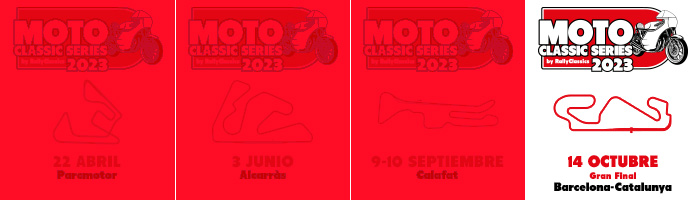 Te espera una temporada con cinco pruebas en cuatro circuitos (Castellolí, Alcarràs, cita doble en Calafat y la Gran Final en el Circuit de Barcelona-Catalunya). En cada una de las cuatro primeras pruebas de la temporada los derechos de inscripción serán 90€ (sin transponder) y la Final 120€ (sin transponder). Los pilotos Junior (menores de 35 años) y las Féminas tendrán un descuento del 50% en los derechos de inscripción por evento. Los pilotos Noveles (primera participación en las MotoClassic Series) tendrán un 50% de descuento en los derechos de inscripción en su primera inscripción.